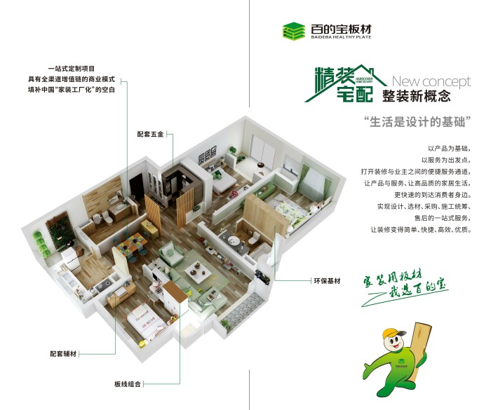 百的寶健康板材?精裝宅配以優質E0級板材、裝飾線條、精工配件等裝修材料為基礎,延伸至裝修選材一站式服務,不止是配套全裝修材料,還提供全裝及家居設計方案,同時對工藝進行深化研發,提供簡單易行高效高質的家居裝配方案。