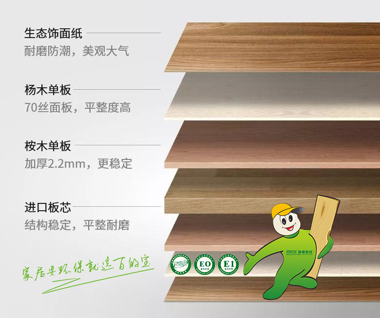 百的寶健康板材品牌:拒絕眼前賺取高額價差的利益誘惑,堅持賣E0級的生態板,讓每個家少了甲醛,多了健康。