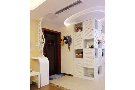 眾多或開放或關閉的玄關格是這個玄關不錯的亮點,開放和封閉相同的設計很好的提供了裝飾和收納兩個功能,無論是綠色植物還是家中雜物都有了不錯的安放之地。