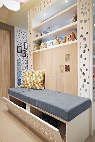 這款玄關設計的很貼心,穿鞋子一直蹲著還是很難受的,做個既能收納又方便了穿鞋時的痛苦,有點小型客廳的感覺。