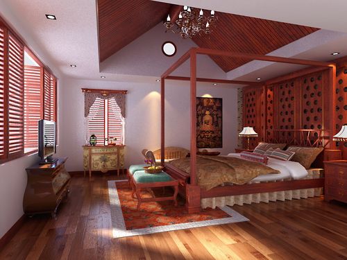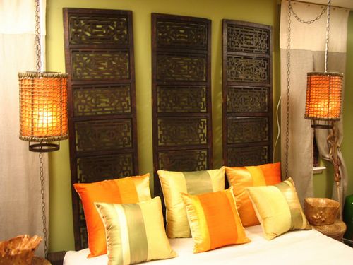 泰式純手工制作的屏風,在兩盞藤蔓特色燈飾下更顯得古香古色。在裝飾上,在窗臺掛一些幔帳石泰式裝修常見的手法,以達到豐富空間表情的作用。另外,若是強調香艷泰式韻味的主人,在紗幔和靠墊的顏色上也可以大膽些,以突出風格特點。