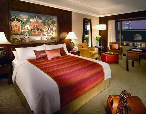 尖頂狀的屋頂,將原有的視野抬升,顯得通透堂皇。大面積棕色基調的家具,白色墻壁上點綴著黑色燈環,這種設計產生了強烈的視覺震憾力,濃郁宗教色彩的裝飾畫讓整個房間產生了一種泰式莊嚴氣質。