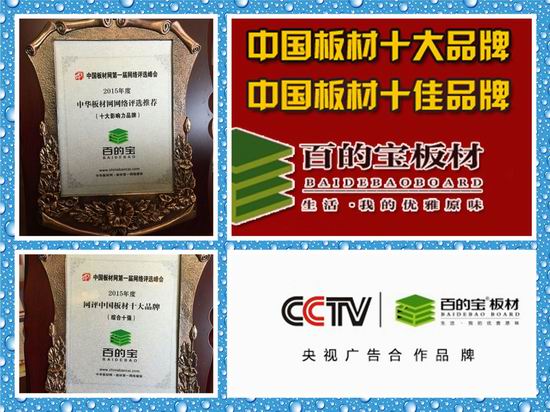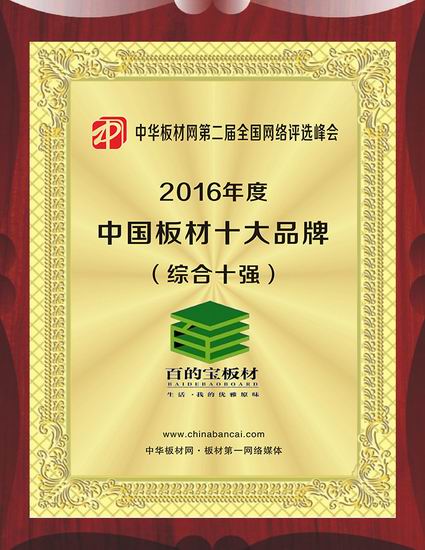 在此次權(quán)威評(píng)選中,百 的 寶憑借著專注做健康板材的匠心,強(qiáng)大的品牌實(shí)力和市場占有率獲得消費(fèi)者和專業(yè)人士的一致認(rèn)可,成功蟬聯(lián)“2016中國板材品牌”的榮譽(yù)稱號(hào)。