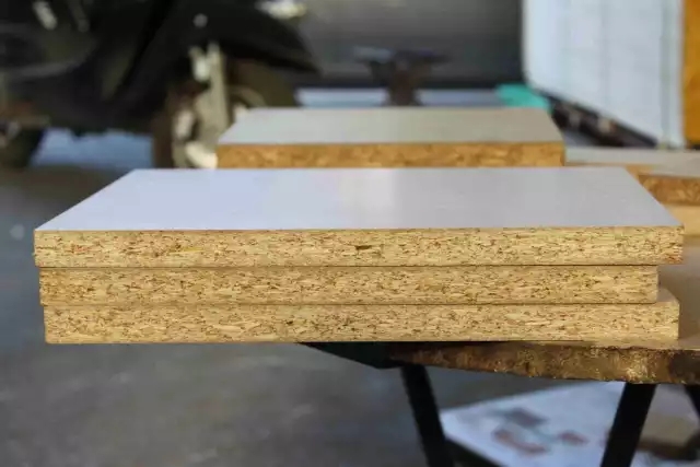 是以刨花板工藝生產的板材,是由木材或其它木質木質纖維素材料制成的碎料,兩邊使用細密木纖維中間夾長質木纖維,施加膠黏劑膠合成的人造板。